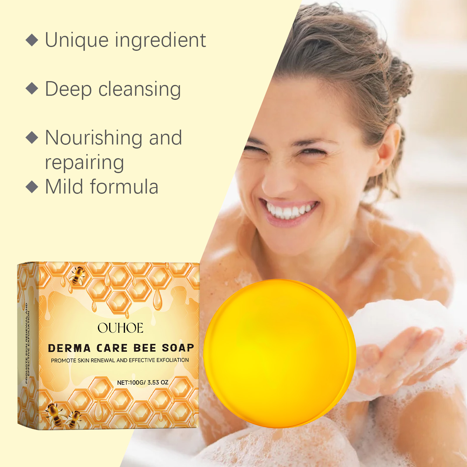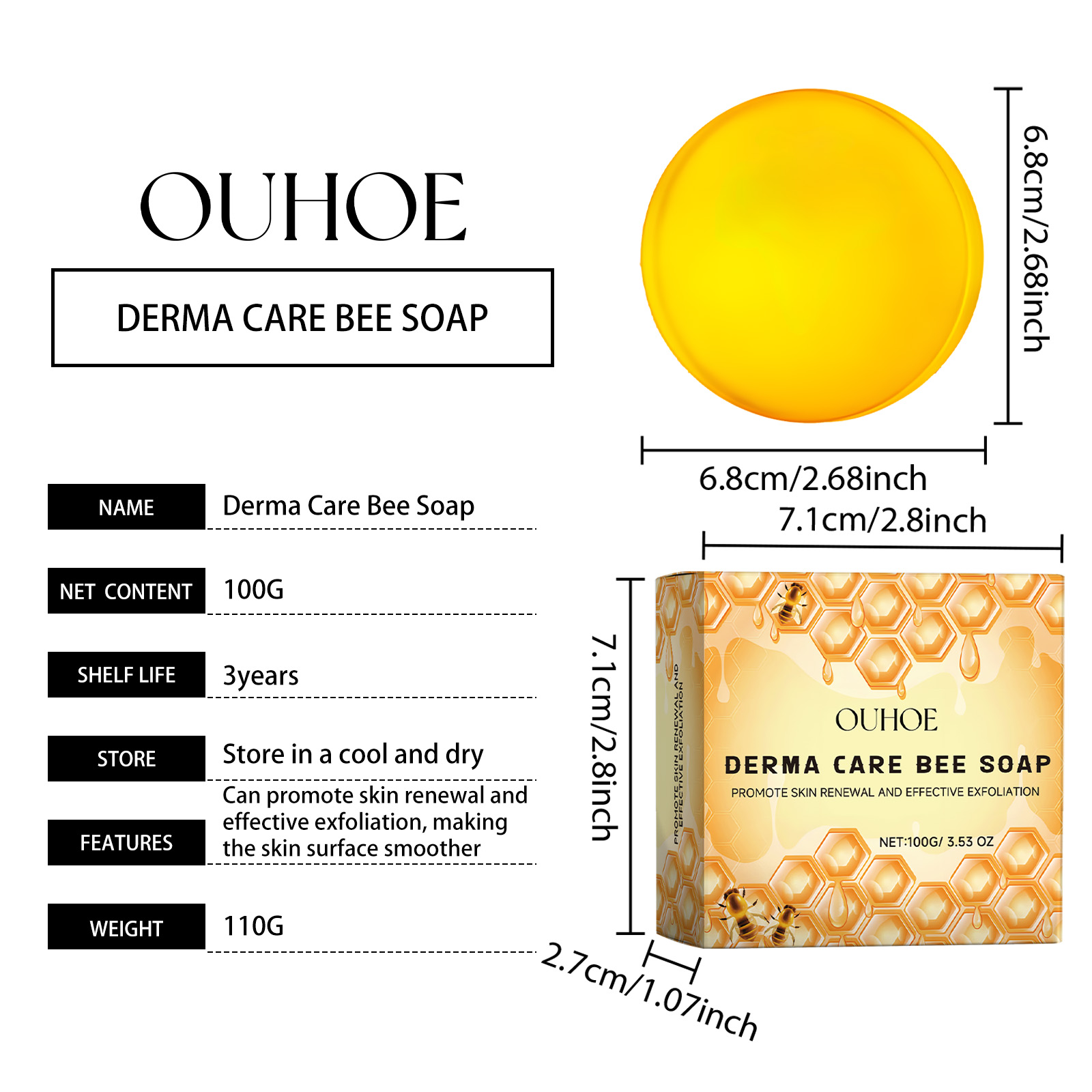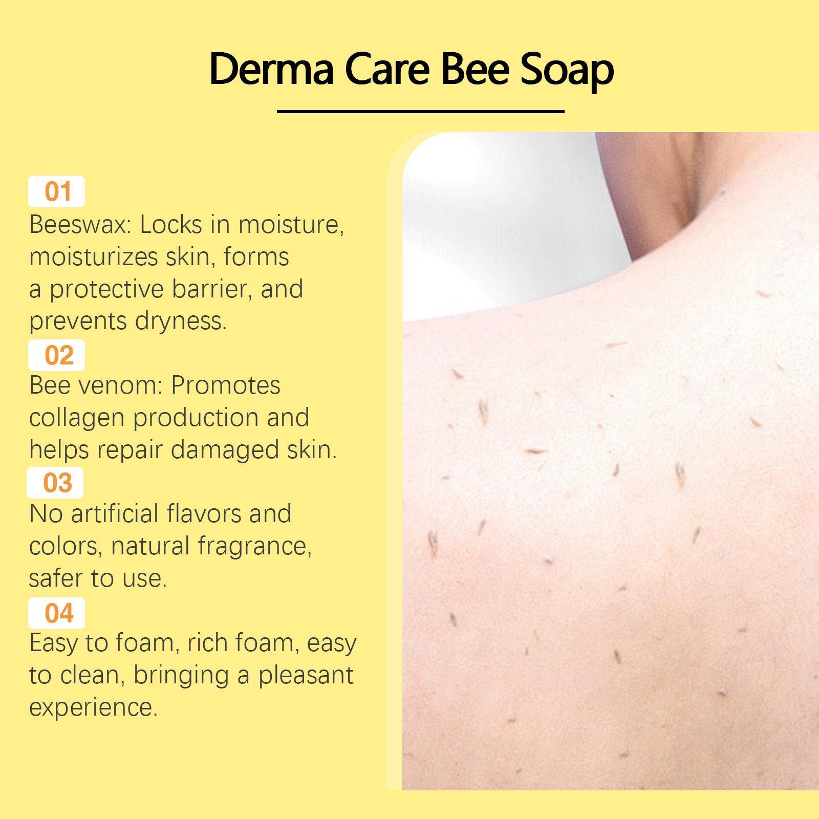 Our Derma Care Bee Soap contains beeswax, bee venom, glycerin. It deeply cleans pores, removes dirt and excess oil, keeps the skin clean, locks in moisture, moisturizes the skin, forms a protective barrier, prevents dryness, promotes collagen production and helps repair damaged skin. Its application is simple: knead the product into the wet palm until it forms a rich foam, apply the foam to the body skin, gently massage to help care for the skin, and finally, rinse with water. Contains rich nutrients, nourishes skin, promotes skin repair and regeneration.